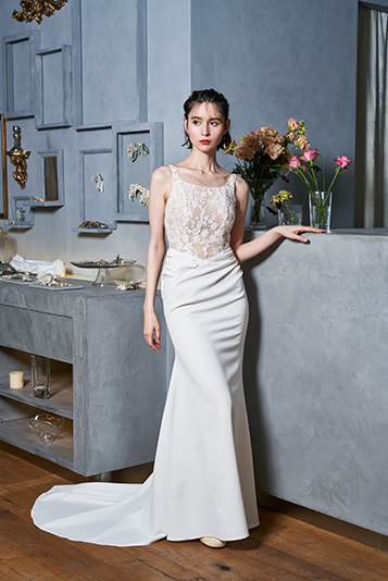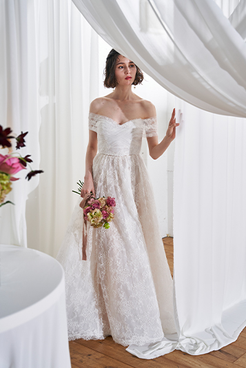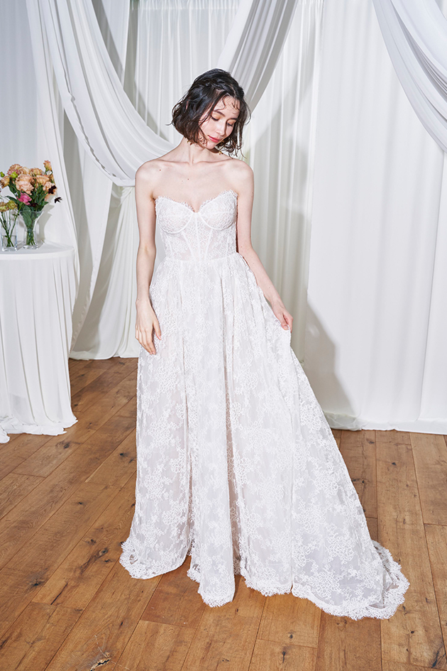 全身に繊細なレースを贅沢にあしらった、視線を惹きつけるビスチェドレス。美しいバストラインに寄り添うトップスと、形を崩さず佇む構築的なボリュームスカートが、軽やかな華やぎと品格を演出します。また、トップスのブラウスを取り外すことでビスチェドレスになる2Way仕様で印象を変えられる、ポーランドのANNA KARAから届いた逸品です。