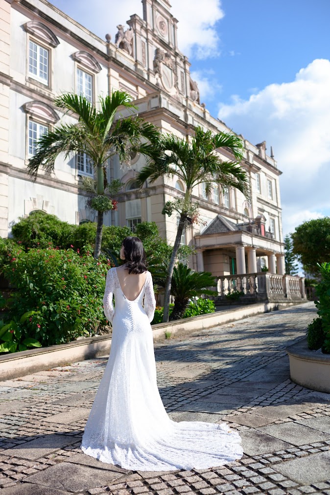 大胆なオープンバックとロングトレーンがバックスタイルを美しく見せるドレスです