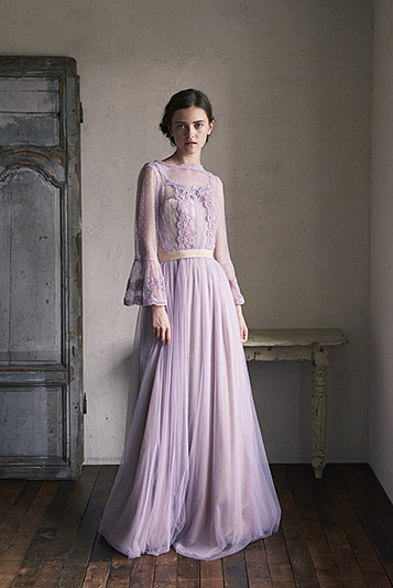 ドットチュールと異なる種類のレースが組み合わされたトップスは、デコルテラインと袖の部分がレースのトランスペアレントになり、フェミニンな印象を演出します。落ち着いたパープルの色合いとパゴダスリーブが、ヴィンテージの雰囲気を漂わせるカラードレスは、Balcony and Bed(バルコニー アンド ベッド)とのコラボレーションから生まれたCli'O mariage(クリオマリアージュ)だけでご案内のできる逸品です。B011PU&PU510-300000
