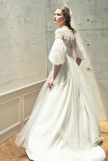 存在感のあるパフススリーブのロールドサガザンのウエディングドレス