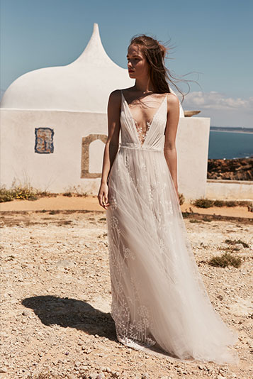 アンナカラのVネックで立体的なリーフモチーフと繊細なチュールでつくられたウエディングドレス